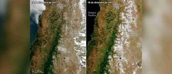 Foto: NASA Chile enfrentó cambios atípicos en su temperatura a comienzos de la temporada de invierno durante 2023, llegando a registrar hasta 38 grados en algunos de los puntos más fríos de la Cordillera de los Andes. A pesar de esto, el hielo se mantuvo en la cadena montañosa, superando incluso los niveles de 2021. … Sigue leyendo A pesar de ola de calor, en los Andes chilenos se quedó la nieve