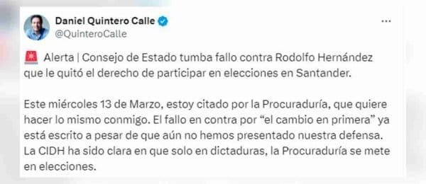 Daniel Quintero anticipa resultado de juicio disciplinario en su contra