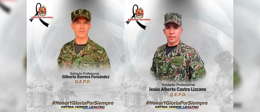 El Ejército Nacional, confirmó que halló los cuerpos sin vida de los soldados profesionales Gilberto Barrera Fernández y Jesús Alberto Castro Lizcano, quienes en medio de unas operaciones militares en el Meta, cayeron a las aguas del Río Duda, donde desafortunadamente perdieron la vida los dos héroes de la patria.