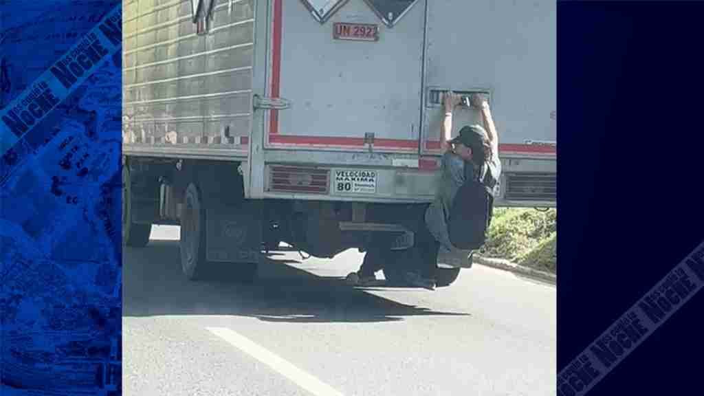 No aprendemos. Exponiendo su vida y sin ningún tipo de seguridad, un joven viaja literalmente colgado de la parte trasera de un furgón.