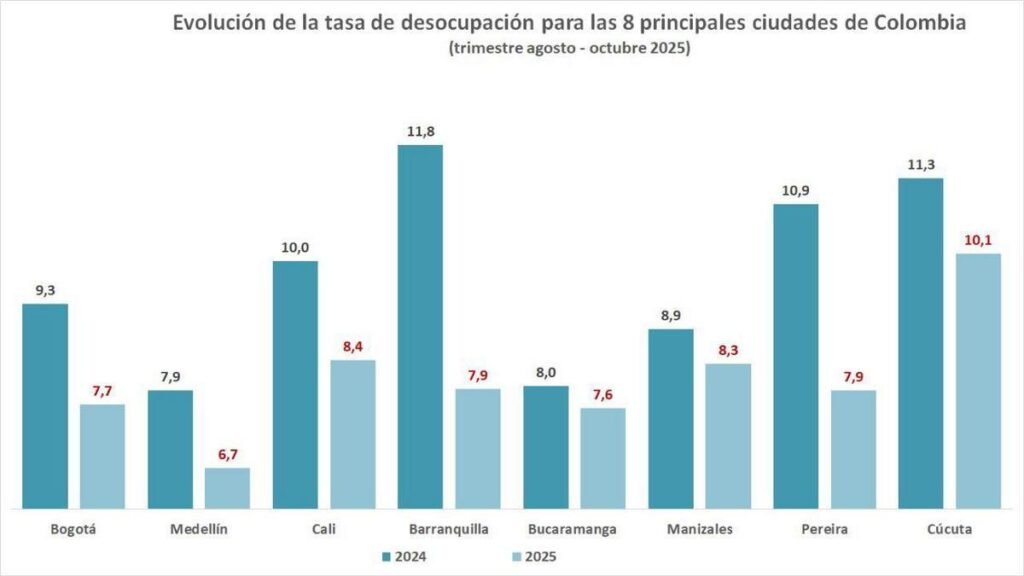 Entre agosto y octubre de 2025, Medellín cerró con una tasa de desempleo del 6,7%, la más baja del país según el informe reciente del DANE. Este resultado se caracteriza por una reducción significativa desde el 7,9% del cuatrimestre anterior, gracias a la generación de más de 72 mil nuevos empleos en la ciudad.