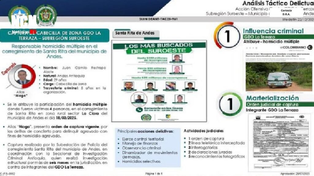 Alias «Moga» es señalado como autor directo de la masacre y gestor de actividades criminales que incluyen desplazamientos forzados, control de finanzas del grupo y ejecuciones selectivas dentro de La Terraza. Según la Policía Nacional, su captura diagramada representa un golpe significativo en las estructuras ilícitas del Suroeste de Antioquia.